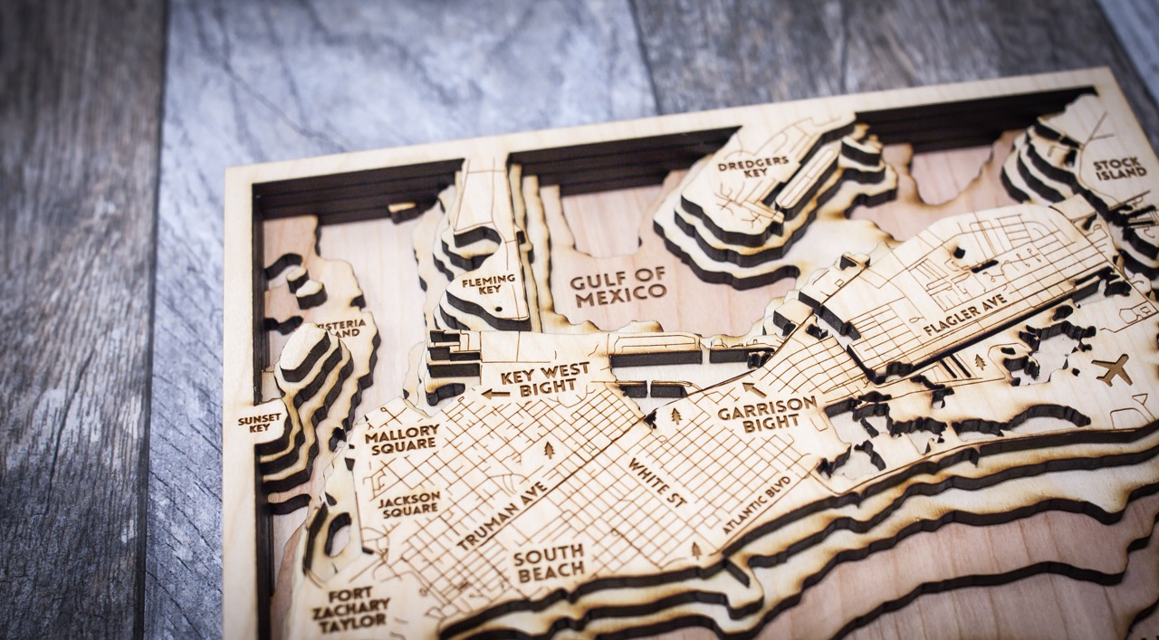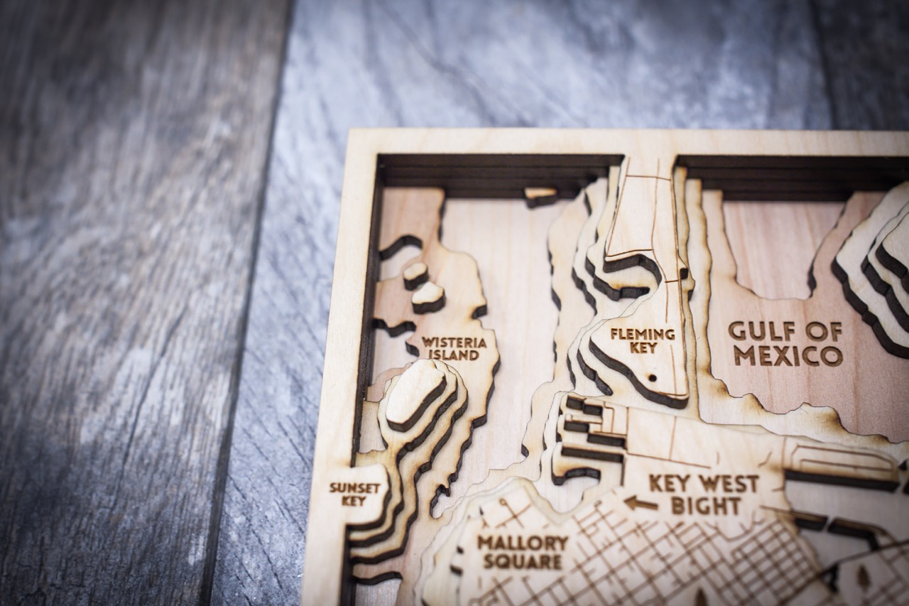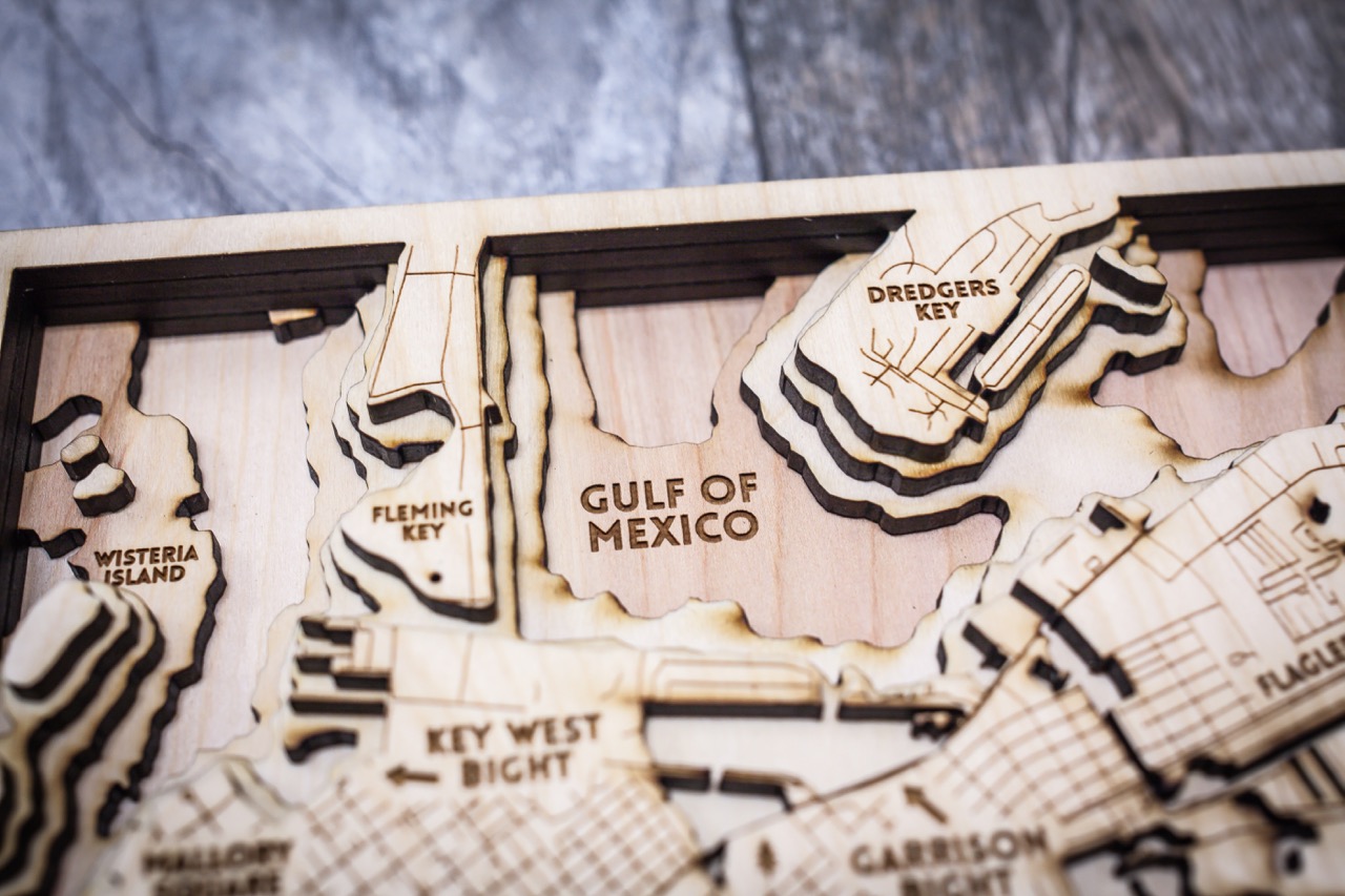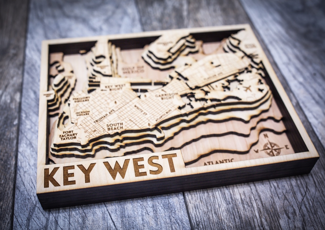 This 3D wood map of the Key West features accurate water depths of the surrounding gulf. The downtown area is detailed enough to see the streets you visited! Medium and Large sizes come with hanging hardware installed. Small sizes typically sit well on shelves or mantels.