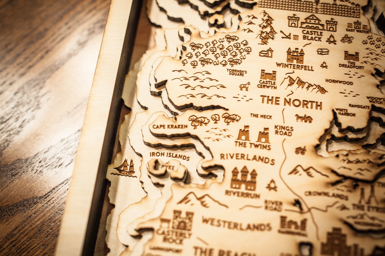This Game of Thrones Wood Map of Westeros is the perfect unique gift for any fan! In addition to a seafloor with contours created from scratch, the terrain is engraved with thousands of intricate details, complete with engraved headings!